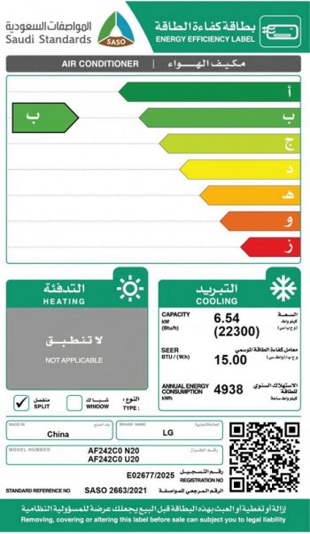 إل جي مكيف سبليت AI Air – تبريد مسبق بالذكاء الاصطناعي – 22300 وحدة بارد فقط – أبيض – AF242C0