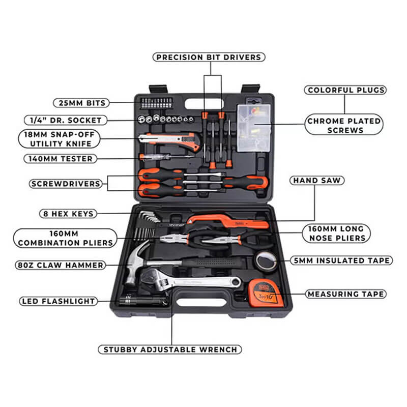 | Accessories Included | Complete toolset including screwdrivers, pliers, saw, hammer, flashlight, bit heads, hex keys, dual measuring tapes, utility knife, adapter, and durable steel handle. |